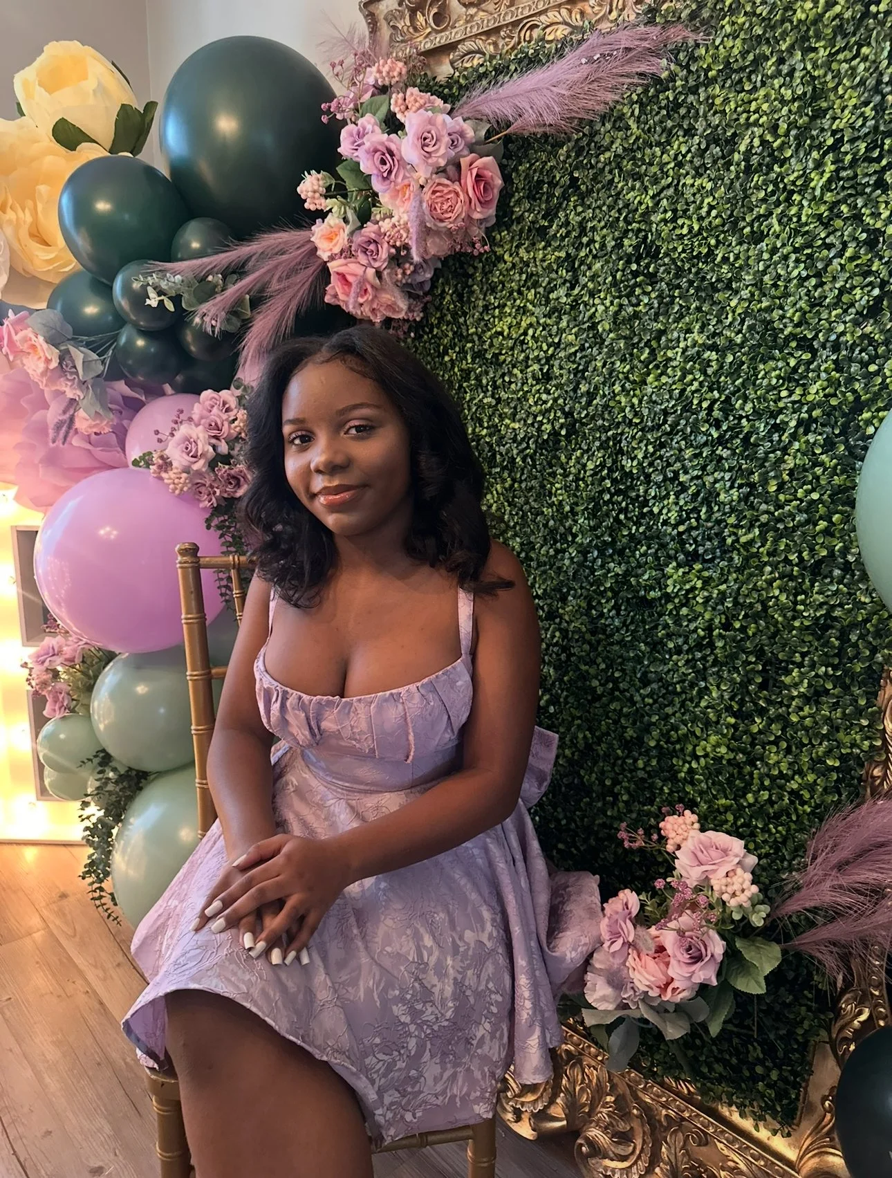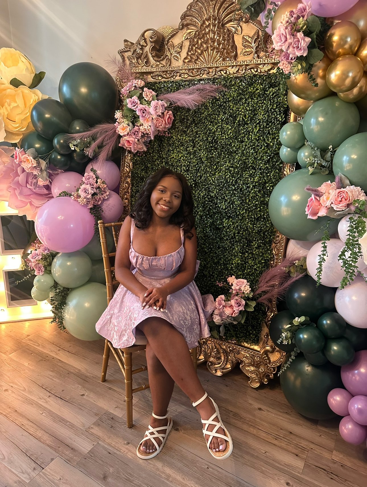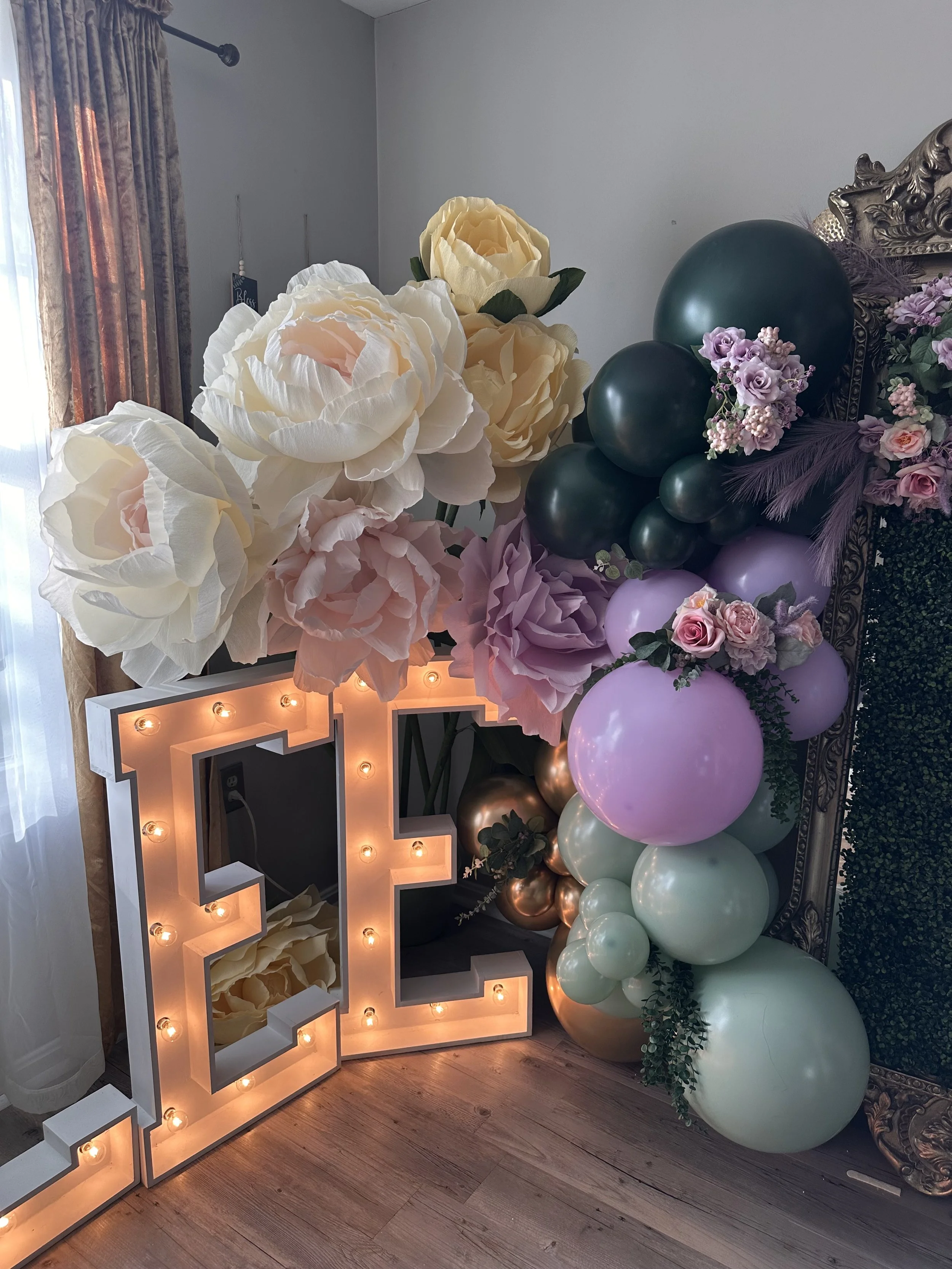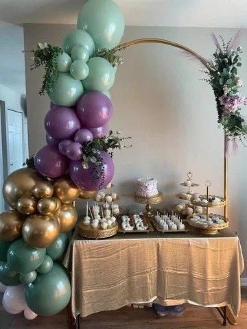 I designed and hand-sewed our custom dresses, featuring delicate detailing and a silhouette that made her feel like royalty. The entire event space was styled from the ground up — complete with lush balloon installations, themed backdrops, and enchanting decorative accents. The dessert table was filled with elegant, handcrafted sweets — each one made by me, combining artistry with flavor. I even hand-built the marquee letters, adding a bold, personalized statement piece that elevated the entire space.